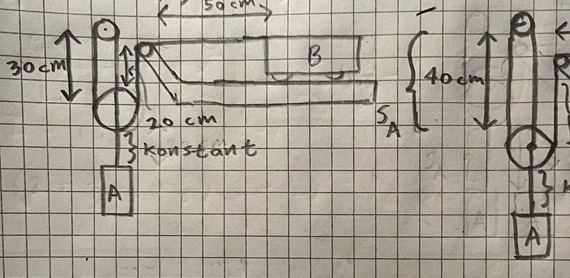 Jag har ett lite liknande exempel i kursboken och försöker typ härma det. Jag kallar sträckan mellan B och första taljen för SB sträckan mellan taljan högst upp och den stora taljan för SA. Men det är väl konstant? Den kanske man bara kan baka ihop i en konstant?