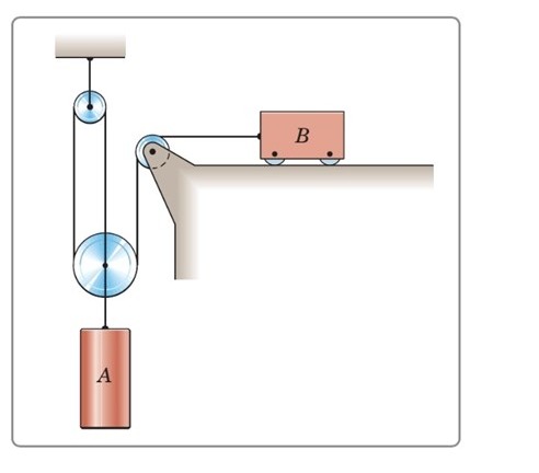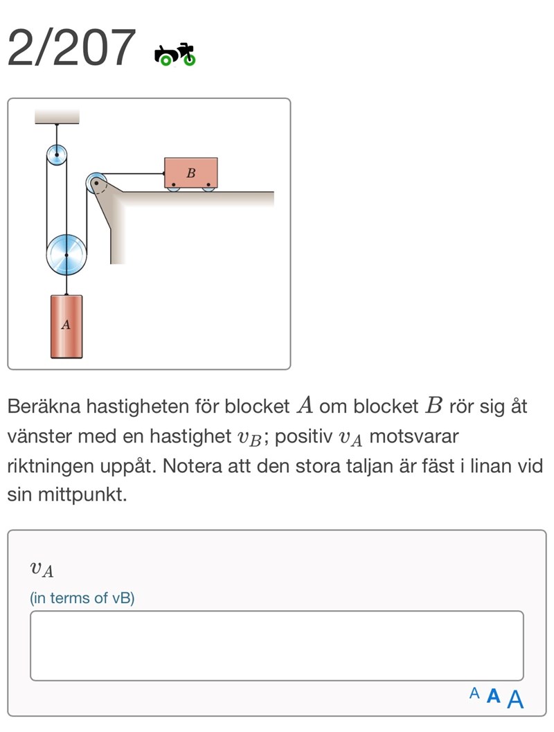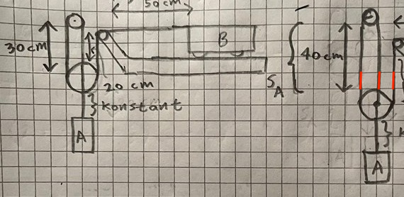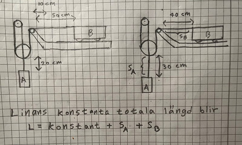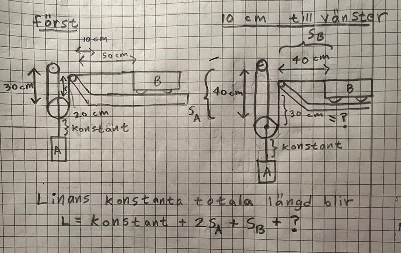Jag tänker att linlängden mellan den översta trissan och den stora trissan är 2SA, och att linlängden mellan B och trissan närmast B är SB, Jag förstår dock inte hur jag ska uttrycka linlängden mellan trissan närmast B och den stora trissan?