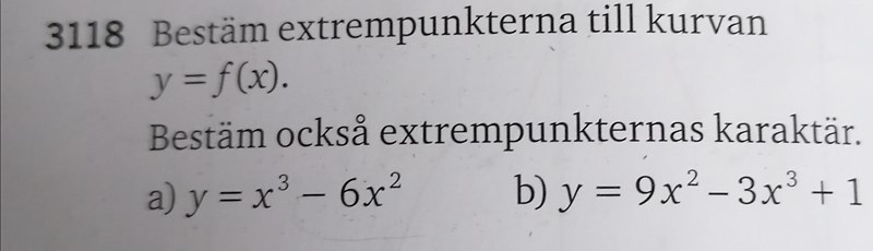 Hej! Jag försöker lösa följande uppgifter. Jag får rätt till den minimipunkt i den första uppgift men sedan får jag fel på de andra extrempunkterna. Jag vet inte vad jag gjort för fel, kanske för att jag ej gjorde en teckentabell. Följande lösning finns nedan.