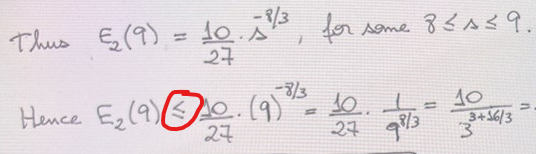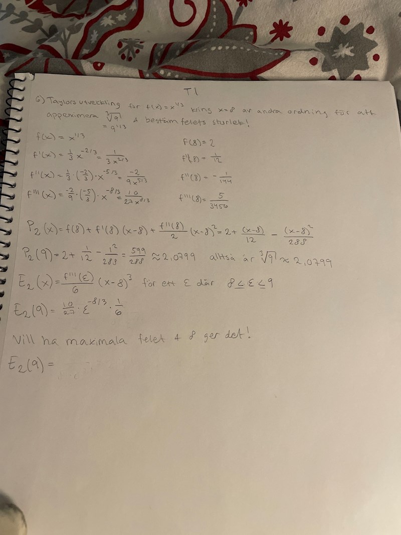 Hej jag behöver hjälp med hur man vet vilket tal man ska ta när man bestämmer felet i taylors utveckling. Som i detta fall ska man välja ett tal mellan 8 och 9 men hur vet jag vilket? Jag trodde man ville ha så stort fel som möjligt för och vara så säker som möjligt att talet ligger i intervallet. Att dela med 8 ger ett större fel än nio men enligt facit är 9 rätt? Hur skulle man veta det. Och även i facit ser det ut som dom inte har med 3! Termen i felet. Har dom glömt den eller är det något jag missar?