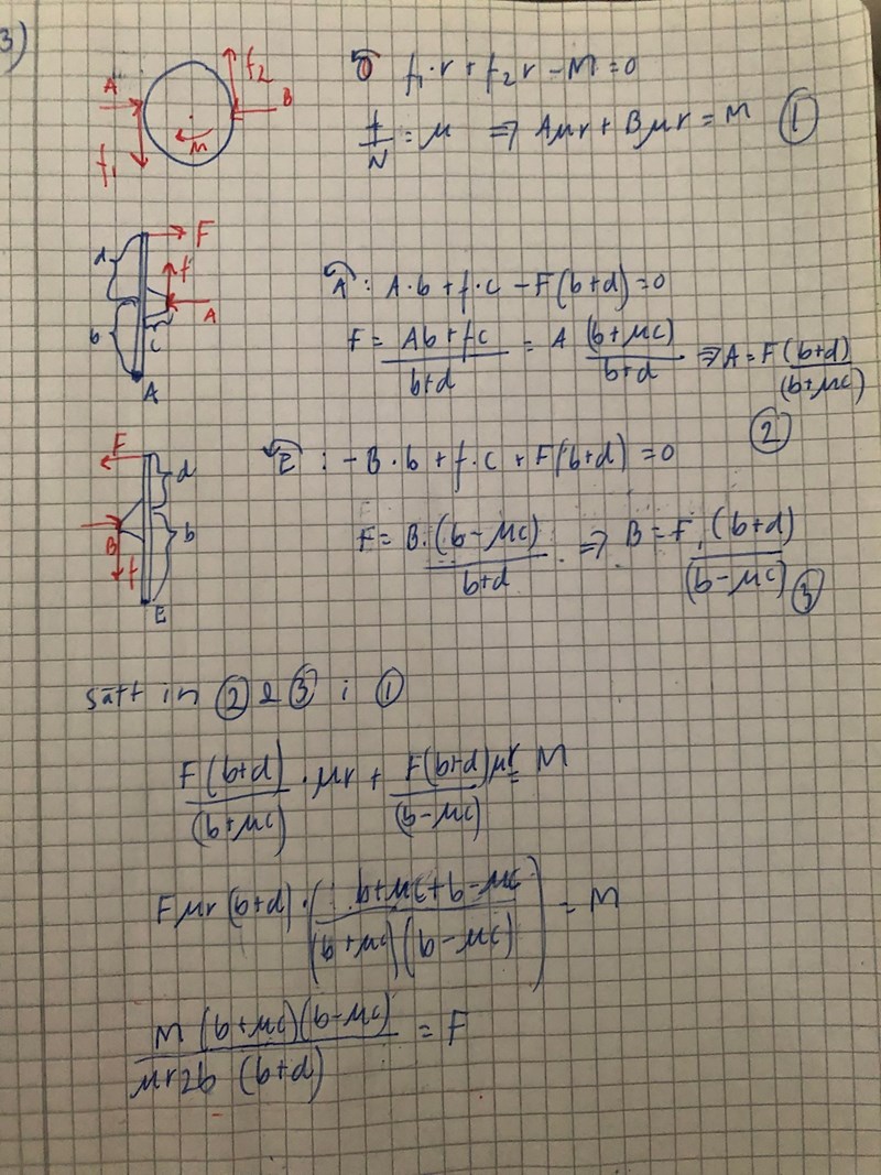 M <= 2*A*μ*r i denna ekvationen, visst är även detta moment kring origo? För att momenten ska kunna ta ut varandra. Och ekvationen 2*A*μ*r=2*f*r där f är friktionskraften?