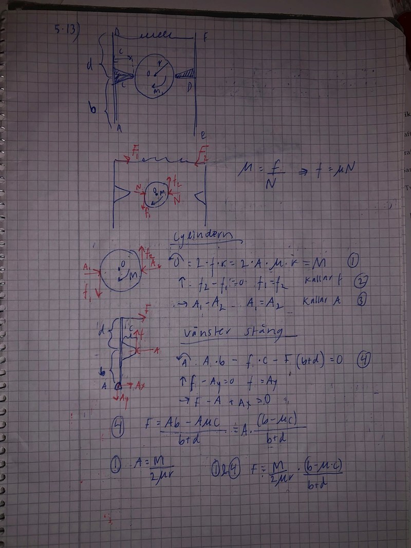 Ture skrev:För att cylindern inte ska rotera medurs måste ett motriktad lika eller större moment finnas, som bromsklossarna C och D står för, Kalla anliggningskraften vid bromsklossarna för A.
