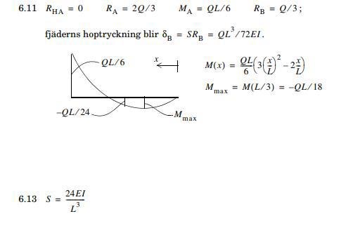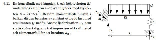 Har försökt lösa den genom att ställa upp ett uttryck för vinkeln i den högra änden som ska vara lika med noll. Då måste jag använda ett elementarfall som inkluderar kraften från fjädern som bygger på styvheten och deformationen. När jag sätter ihop allt detta blir det väldigt komplicerat vilket får mig att tro att jag tänkt fel någonstans. De två elementarfall jag använt matchar de som användes i facit för uppgift 6.11 så de tror jag inte jag valt fel i alla fall.