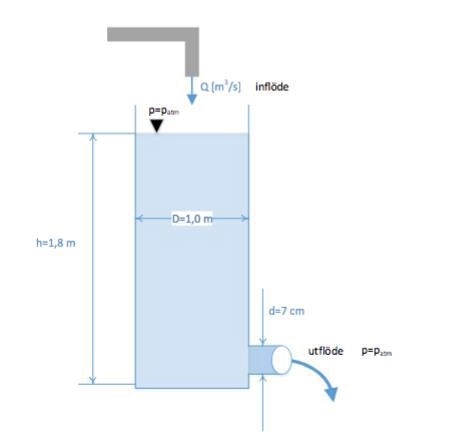 En vattenström flödar ut ur en tank genom en öppning i botten som har diametern 7 cm. Tanken själv har diametern d=1,0 m och är öppen i toppen. Där tillförs ett vattenflöde. Bestäm den flödeshastighet q [m3/s] med vilken vatten behöver tillföras tanken för att vattendjupet i tanken, h, ska hållas konstant.