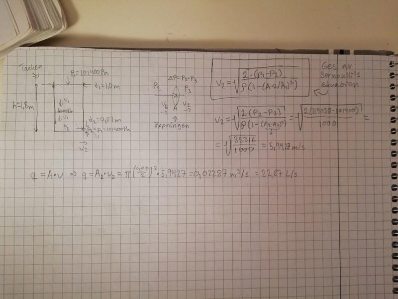 MaDy skrev:Teraeagle skrev:Jag får samma svar som du när jag räknar på det, så svaret är troligen rätt. Man ska som sagt använda Bernoullis ekvation, teckna uttryck för hastigheterna m.h.a. volymflödet och tvärsnittsareorna på in- och utlopp samt konstatera att trycket är lika stort på båda platser då de är öppna mot atmosfären.