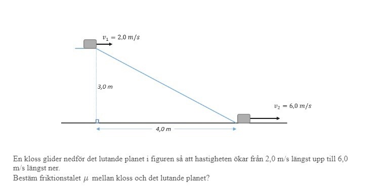 skulle jag ställa upp som början. Då energin före och efter är inte samma på grund av friktionskraften. Notera att sträckan som variabel är okänd och är inte en vanlig normalkraft för att den påverkas av ett lutande plan och kan då skrivas som där theta är vinkeln är placerad mellan hypotenusan och 4 meters sidan. Cosinus måste användas för att det är en definierande egenskap hos just kraften i det här fallet.