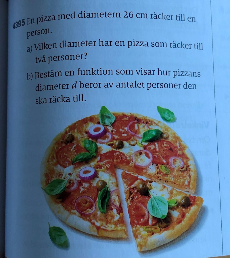 ”Bestäm en funktion som visar hur pizzans diameter d beror av antalet personer den ska räcka till.”