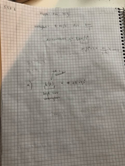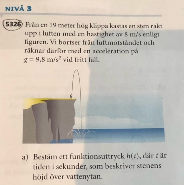 Hej, på a) uppgiften där man ska bestämma uttrycket undrar jag varför det ska bli -4,9t2, hur blev 9,8 det? Jag förstår de andra siffornas funktion samt varför den ska vara "-", men inte varför det blir 4,92.