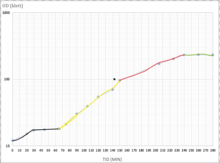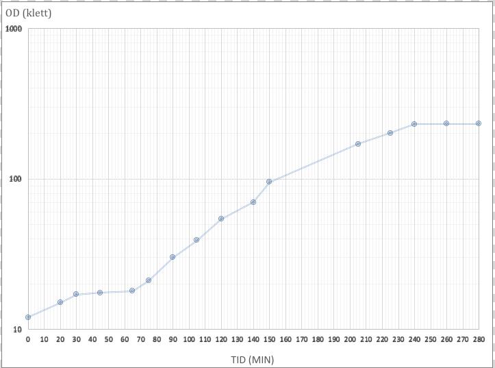 Den del av kurvan som närmast motsvarar den klassiska exponentiella tillväxten hos E. coli, är mellan 65-150 minuter.