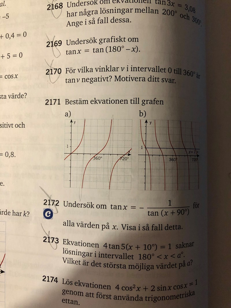Jag behöver lite stöd när det kommer till att tolka graferna av tangens. Jag tycker det är enklare att bestämma en ekvation av en graf från en cossinuskurva eller sinuskurva men tangens skrämmer mig. Se bild nedan. Vad finns det för metoder att följa när man ska läsa av och bestämma en ekvation av en graf för tangens? Inga konkreta tips ges heller i boken tycker jag.