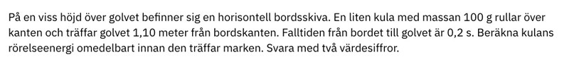 Smaragdalena skrev:Just när kulan trillar över bordskanten så har den en viss hastighet i x-led (som är konstant, om man kan bortse från luftmotståndet) som beror på hur snabbt kulan rullade på bordet, och hastigheten 0 i y-led (som accelererar med accelerationen g).