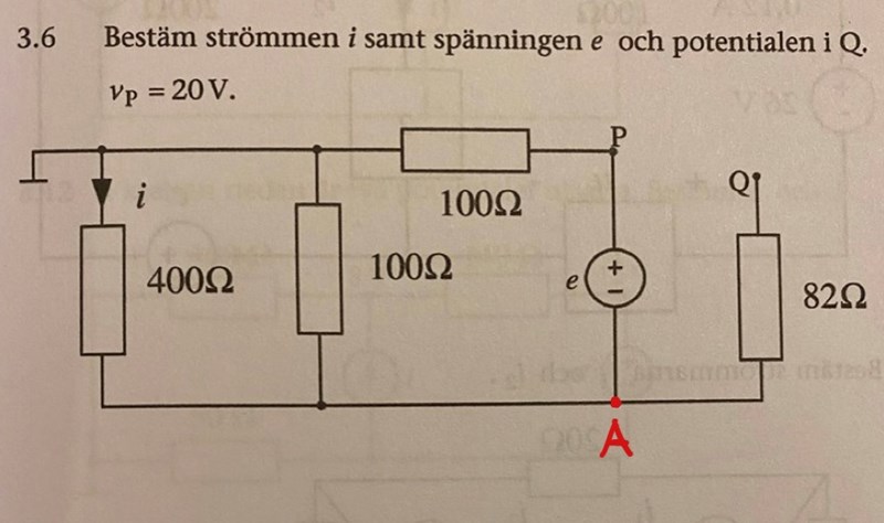 Du vet potentialen i P. Om du går nedåt genom e, som du redan beräknat spänningen över, vad är då potentialen nedanför e?