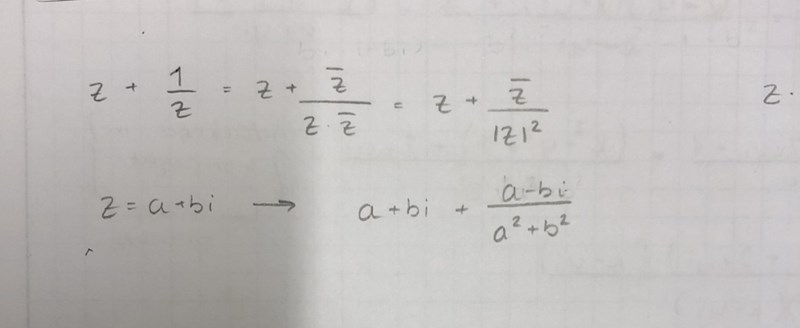 Här ser du direkt att z+z-1z+z^{-1} har imaginärdel noll precis då zz ligger på enhetscirkeln i det komplexa talplanet; beräkningen visar också att summan i detta fall är lika med komplexa talet 2Re(z)+i0.2\text{Re}(z)+i0.