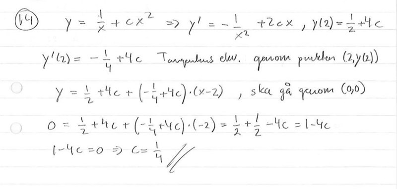 Bestäm den positiva konstanten c i funktionen så att tangenten till kurvan då x = 2 går genom origo.