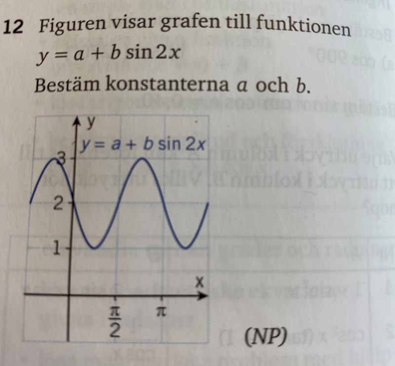Så jag har denna uppgift!  a=2, då sinuskurvan hoppar två steg uppåt. Enligt facit ska b vara -1, jag får b till b=(3-1)/2=1. Är det jag som har fel eller står det fel i facit? 🤔