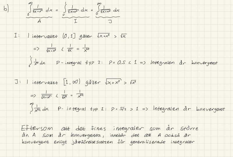 Om detta gränsvärde existerar och är ändligt är integralen konvergent, annars divergent. Men för att bestämma gränsvärdet på detta sätt måste man först kunna bestämma integralen. Kan man komma förbi detta på något sätt?. (Såg nu att jag glömde skriva roten ur i bilden)
