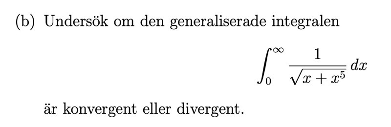 Jag vet hur man ser om den är konvergent eller divergent men jag har problem med att bestämma själva integralen. Jag har försökt att skriva om nämnaren till x0.5 * (x4+1)0.5 och använda variabelsubstitution för x0.5 men jag kommer ingenstans. Är det något som har något tips på hur man kan gå till väga?