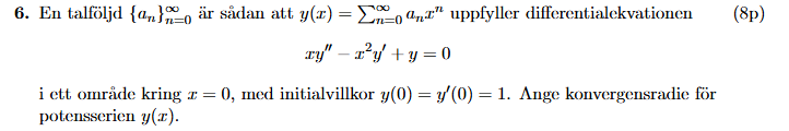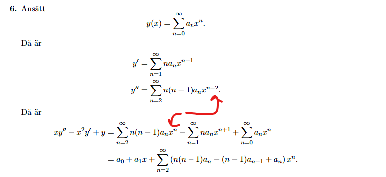 (När du kollar i facit, så startar serien för y'y^\prime med n=1n=1 och för y''y^{\prime\prime} med n=2n=2.)