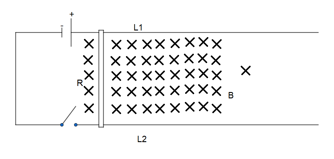 Figuren visar två horisontella ledningstrådar L1L_1 och L2L_2 med försumbar resistans. Trådarna går genom ett homogent magnetfält som har mycket stor utsträckning. Magnetfältet är i figuren riktat vertikalt nedåt, och är så starkt att det jordmagnetiska fältet kan försummas.  På trådarna vilar en rörlig metallstav med resistansen RR, så utformad att den inte glider av trådarna hur långt den än rullar. Ledaren är från början i vila. När kretsen sluts, börjar den rörliga delen att rulla åt höger.