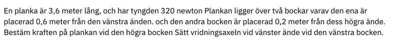 I VL är momentarmen 3.6m-0.8m, dvs 2.8m, eftersom vi räknar det vinkelräta avståndet mellan vänstra bocken till den högra bocken, då det är vid den högra bocken som man har kraftens riktningslinje uppåt, dvs momentet moturs. Normalkraften här är okänd.