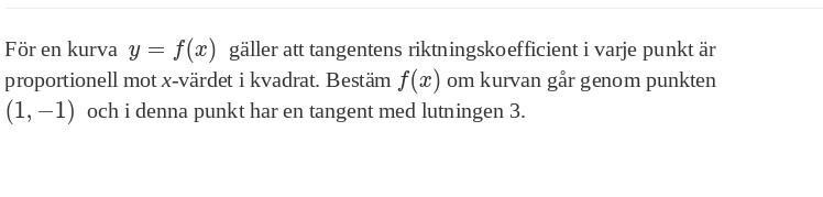 Du kan lösa ut för i och med att du vet att derivatan är i punkten . Integrera nu detta så att du får ett uttryck för . Uttrycket kommer att ha en konstant som du kan bestämma i och med att funktionen går genom .