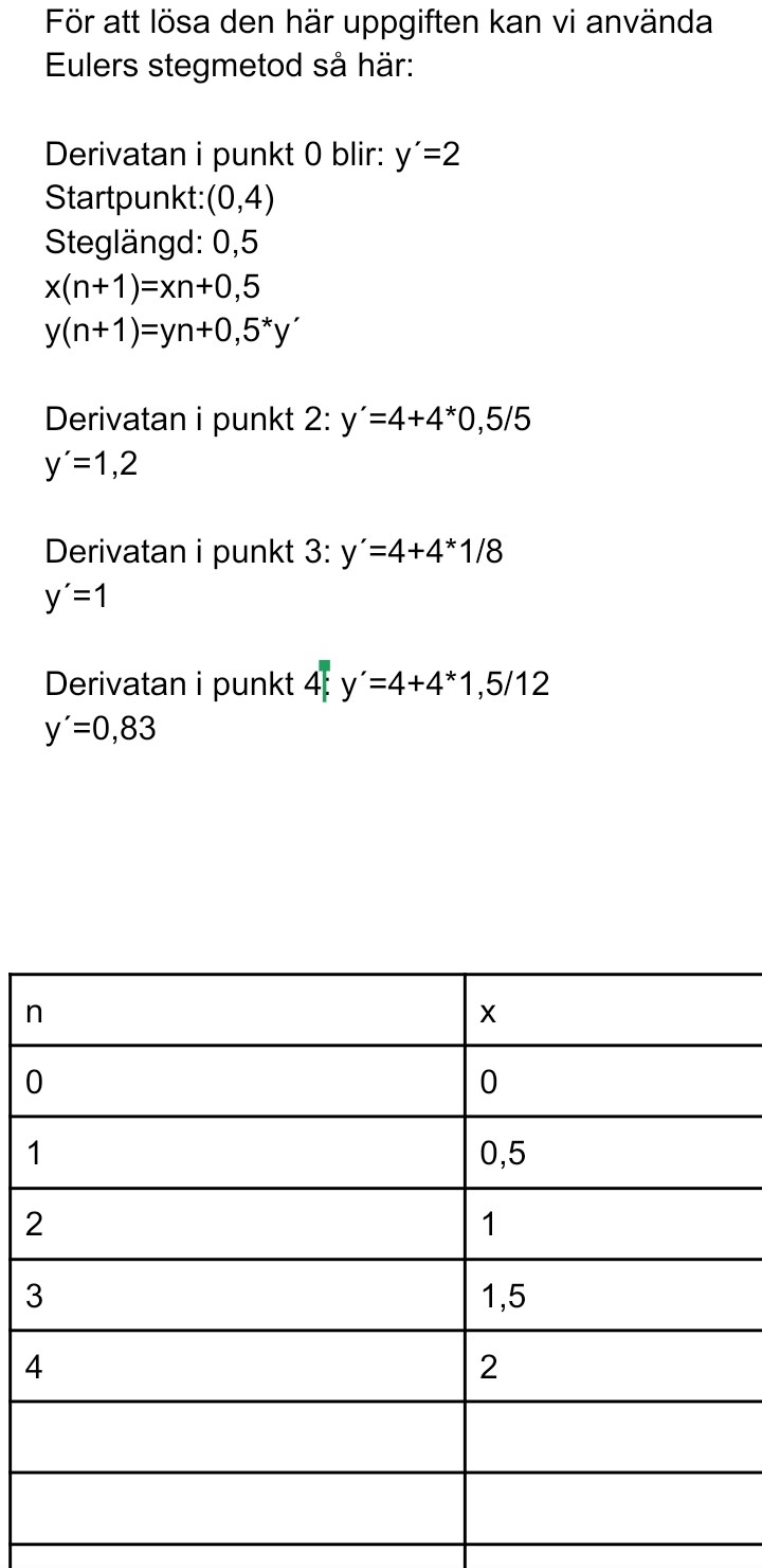 Sen kan vi sätta in x=1,5 och y=10,4095 i uttrycket för y´ och får då värdet y´=4+4*1,5/10,4095=4,576. Eulers formel med steglängden 0,5 ger att nästa punkt har koordinaterna x=xn+0,5=2 och y=10,4095+0,5*4,576=12,6975. Då vet vi att nästa punkt har koordinaterna x=2 och y=12,6975.