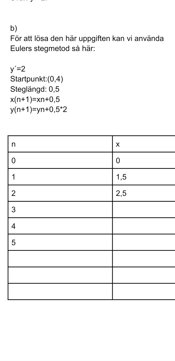 b) Det står inte att du ska använda någon specifik metod så du kan nog välja lite fritt för att approximera . I matte 5 går man väl igenom Eulers stegmetod? Testa den med någon valfri steglängd, kanske eller liknande (förutsatt att det ska göras för hand).