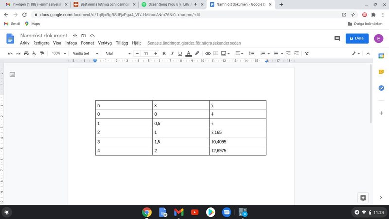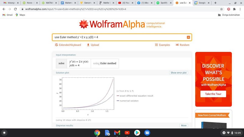 Sen kan vi sätta in x=1 och y=8,165 i uttrycket för y´ och får då värdet y´=4+4*1/8,165=4,489. Eulers formel med steglängden 0,5 ger att nästa punkt har koordinaterna x=xn+0,5=1,5 och y=8,165+0,5*4,489=10,4095. Då vet vi att nästa punkt har koordinaterna x=1,5 och y=10,4095.