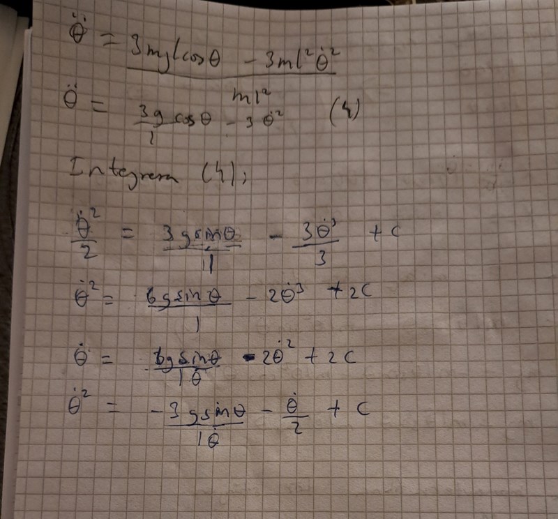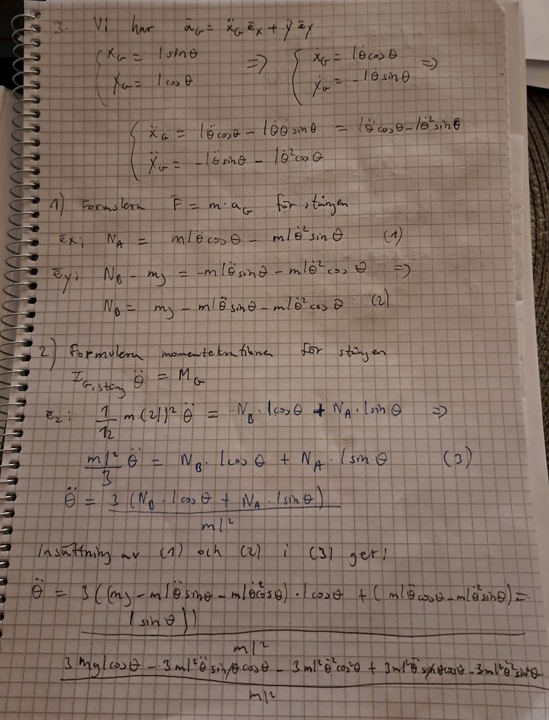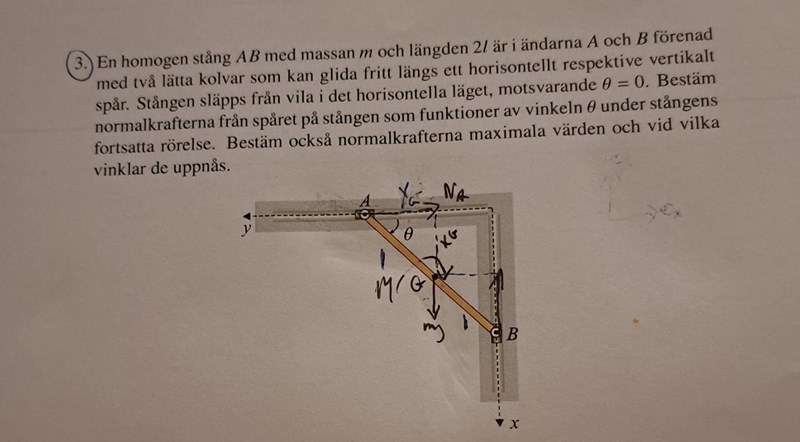 Såhär långt kom jag med min lösning. Problemet är bara hur jag ska bestämma konstanten C. Vid början vet vi att theta är 0 då stången släpps , men är även thetaprick 0 då? Sen är jag osäker på hur Na och Nb bör vara riktade.