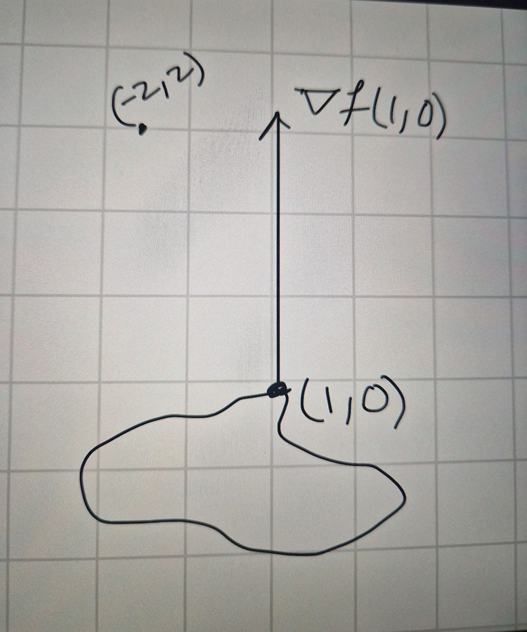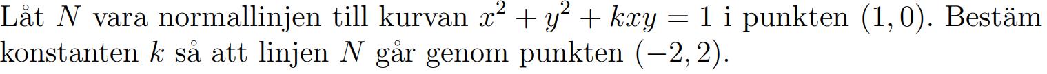 Jag tror att normallinjen är gradienten i (1,0)? Om det är så blir den (2,k). Men sen ska den gå genom (-2,2) hur kan man göra då att den gör det?