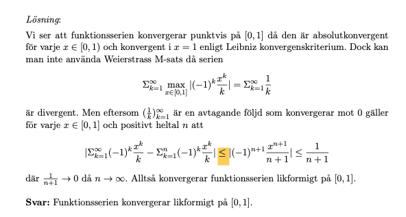 k=n+1-1kakan+1 \displaystyle \left| \sum_{k=n+1}^\infty \left(-1\right)^k a_k \right| \le a_{n+1}  gäller  så länge  ak0a_k \searrow 0.