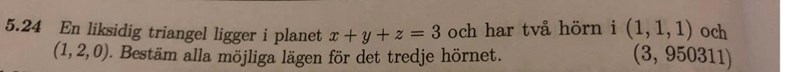 Har jag fastnat. Jag tänkte att man kunde använda sig av normalen till planet (1, 1, 1) och vektorn