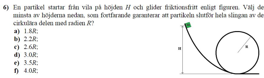 Hej har försökt lösa denna. Jag får att H = 2,5R men i facit står det 2,6R. Min lösning var att använda mekaniska energilagen vilket ger