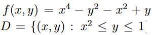 Just det. Då får vi f(x,1) = x^4+x^2 och f(x,x2) = 0. Om man nu efter detta ska söka extremvärden på det "vanliga sättet" för envariabelfall, betyder det att man ska leta efter kritiska, singuljära och randpunkter för denna funktion också? Alltså genom att derivera och kolla när denna envariabelfunktion är noll och så vidare.
