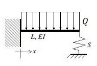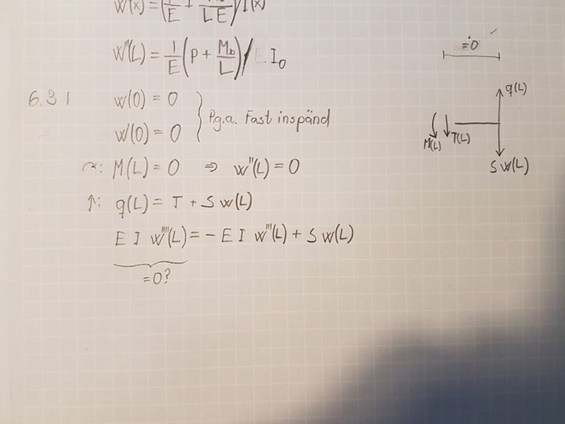 Detta betyder alltså att tvärkraften inuti balken kan relateras till tredjederivatan av nedböjningen enligt denna differentialekvation. Om vi nu tittar på din snittning så har du med en kraft q(L) som pekar uppåt men q(x) är en lastintensitet med enhet [N/m]. Därmed är din jämviktsekvation väldigt fel då du likställer helt olika storheter med varandra. Dessutom skulle du inte kunna ha en lastintensitet i en punkt eftersom den är lika med noll om den inte har någon bredd. Till slut så tycker jag att fjäderkraften pekar åt fel håll eftersom i elastiska linjens ekvation är positiv nedböjning nedåt vilket gör att den ska peka uppåt (fjädern är intryckt). Detta kan dock skilja sig mellan definitioner och det kan vara annorlunda i din kursbok.