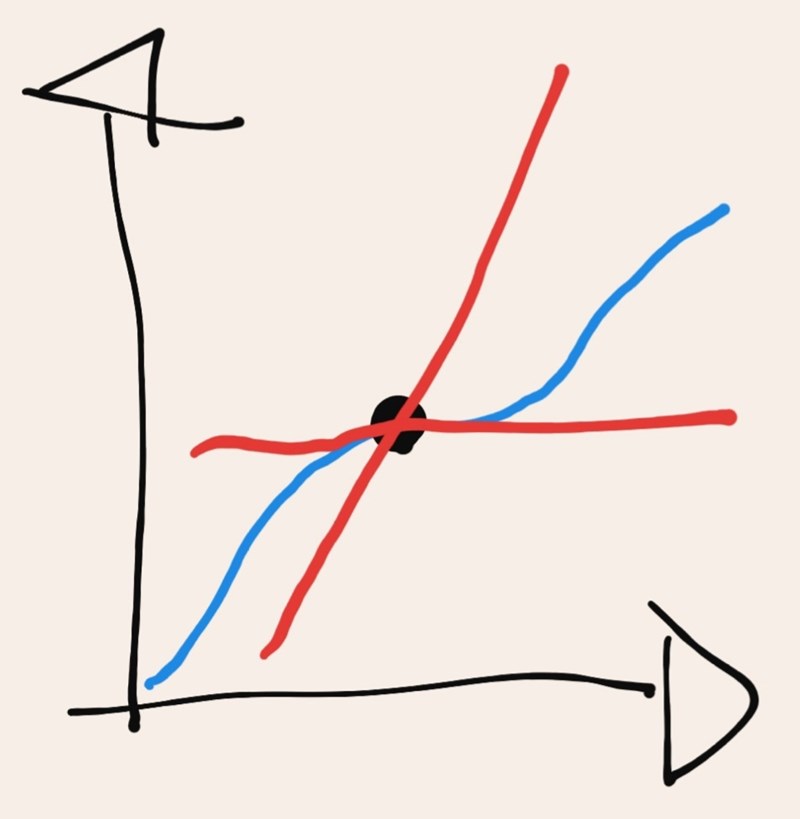Se exenpel nedan för två linjer som går genom samma punkt. De linjerna har olika lutning, eller hur?