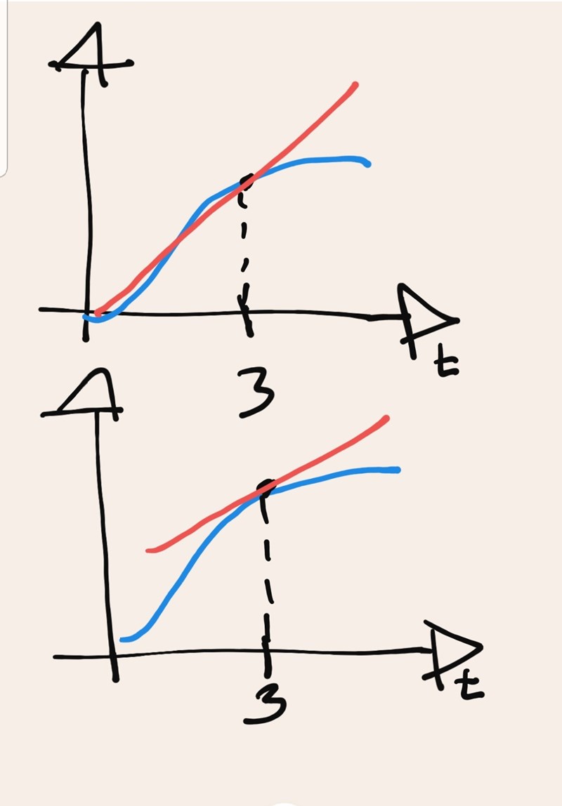 Är skillnaden då att i det första diagrammet är det en sekant, medan i andra så är det en tangent. Är det de jag ska se? Jag vet inte om jag riktigt förstår