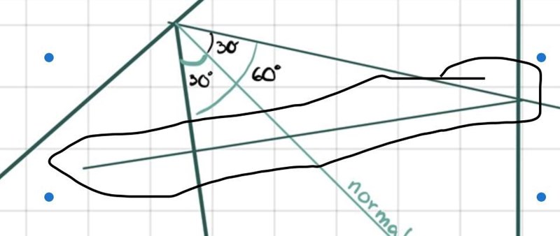 (Om det stämmer) annan situation där infallsvinkeln är 35° istället för 30°, är lösningen då (följer samma metod) ->