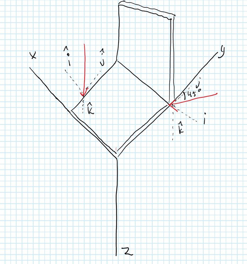 Jag ser en 3D bild där det finns x antal olika krafter som verkar på produkten. Jag ritar upp alla vinklar (x,y,z) till en 2D bild och ser vilka krafter som syns på vilken ritning. Utifrån detta gör jag en vanlig beräkning för att få ut i, j och k. Stämmer det? Till exempel så blir en kraftpil en punkt om man tittar på X och Y graf, då försvinner den i beräkningarna?