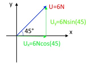 I y-led blir komposanten Uy=6N·sin(45)4.24NU_y=6\mathrm{N}\cdot \sin(45)\approx 4.24\mathrm{N}
