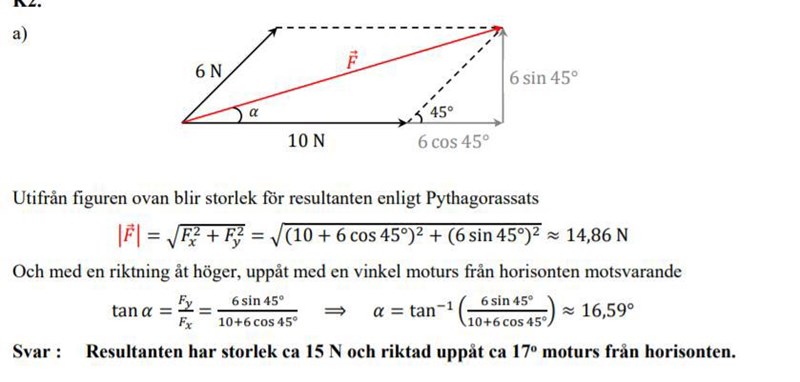 Resultanten blir Roten ur ((krafterna i xled)² + (krafterna i yled)²)= (Ux+10)2+Uy214.9N\sqrt{(U_x+10)^2+U_y^2}\approx 14.9\mathrm{N}