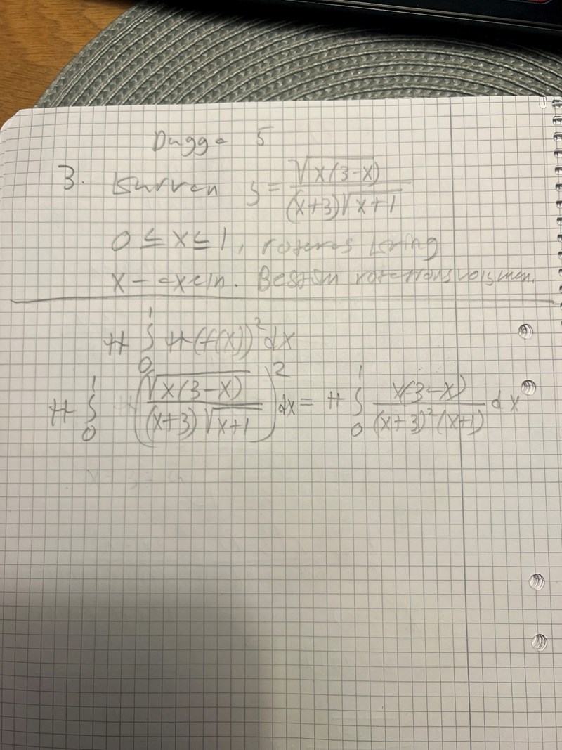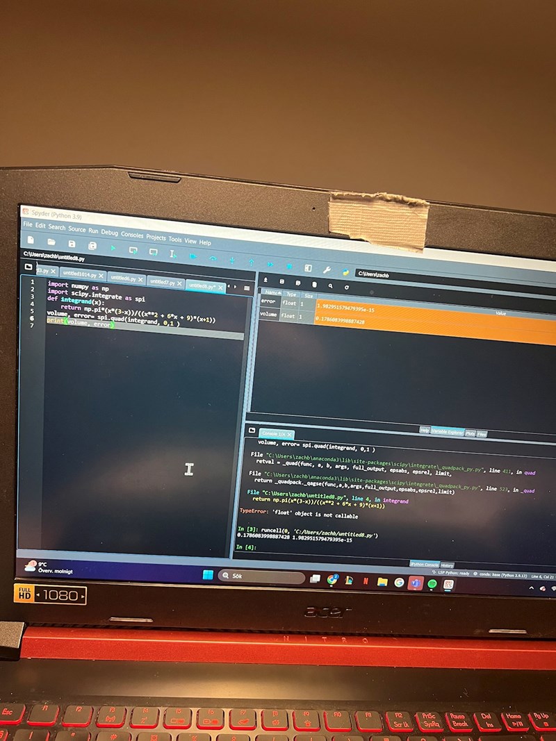 Jag ska beräkna en rotationsvolym. Men kommer ingen vart efter sista steget. Jag testade med olika substitutioner men ingen hjälpte alls. Jag testade skriva en kod på spyder för att beräkna detta med jag får fel svar även om programmet räknade ut det helt korrekt. Se nedan.