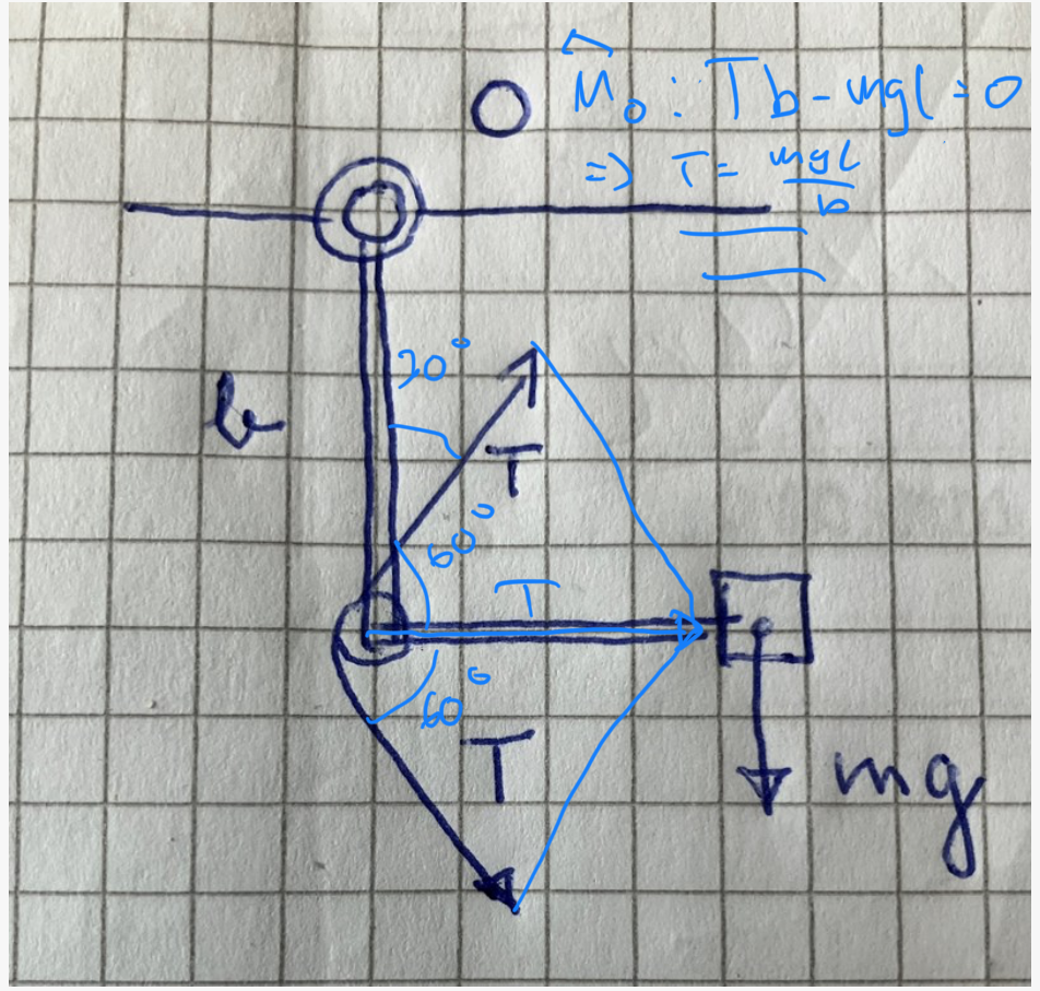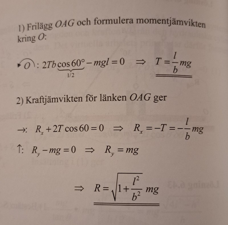 Jag förstår inte ditt moment för T för vi har Ty och Tx. Båda ger väl moment?  Jag kan inte utläsa detta från din figur. Såhär gjorde facit nedan. Jag förstår mgl men inte 2Tbcos60 , det låter som att endast Tx utövar ett moment men inte Ty och det fattar jag inte. Är det för Ty verkar längs med momentpunkten eller bara att Ty saknar hävarm medan Tx har en hävarm från A till O?