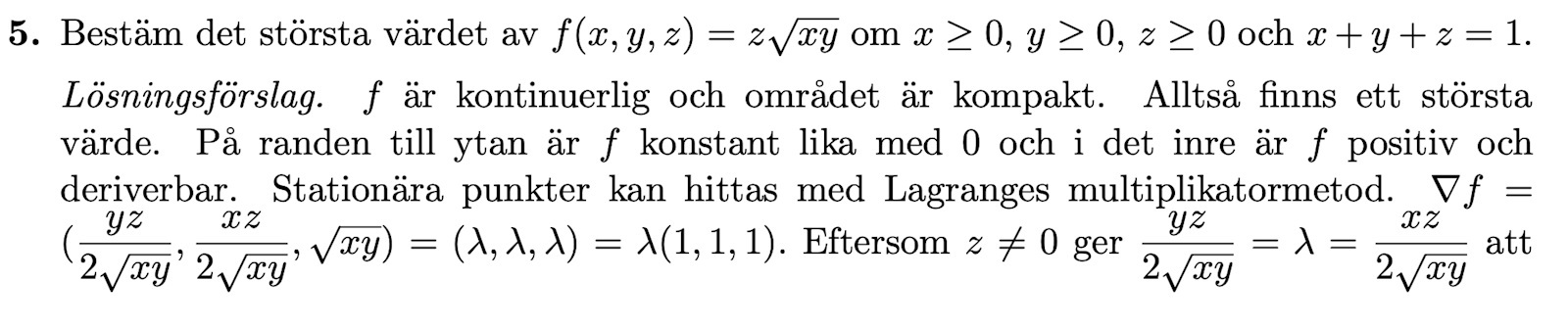 Jag sitter och funderar över den här uppgiften och det jag har svårt att förstå (kanske bara är jag som är lite trött men) är området liksom bara som jag ritat upp (lite dålig bild) men alltså att det består av randen till tetrahedronen (eller vad det nu kallas), eller är det liksom en ifylld/solid grej? Jag tänker att om x+y+z=1 ska vara uppfyllt så är det randen till området liksom(?). I lösningförslaget nämner de att "i det inre är f positiv och deriverbar" men de kanske nämner det för att man ska kunna använda Lagranges metod på problemet?
