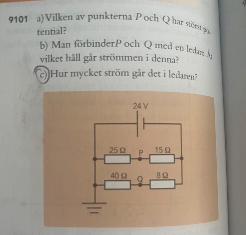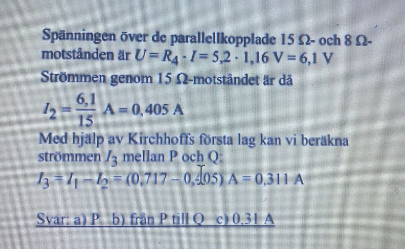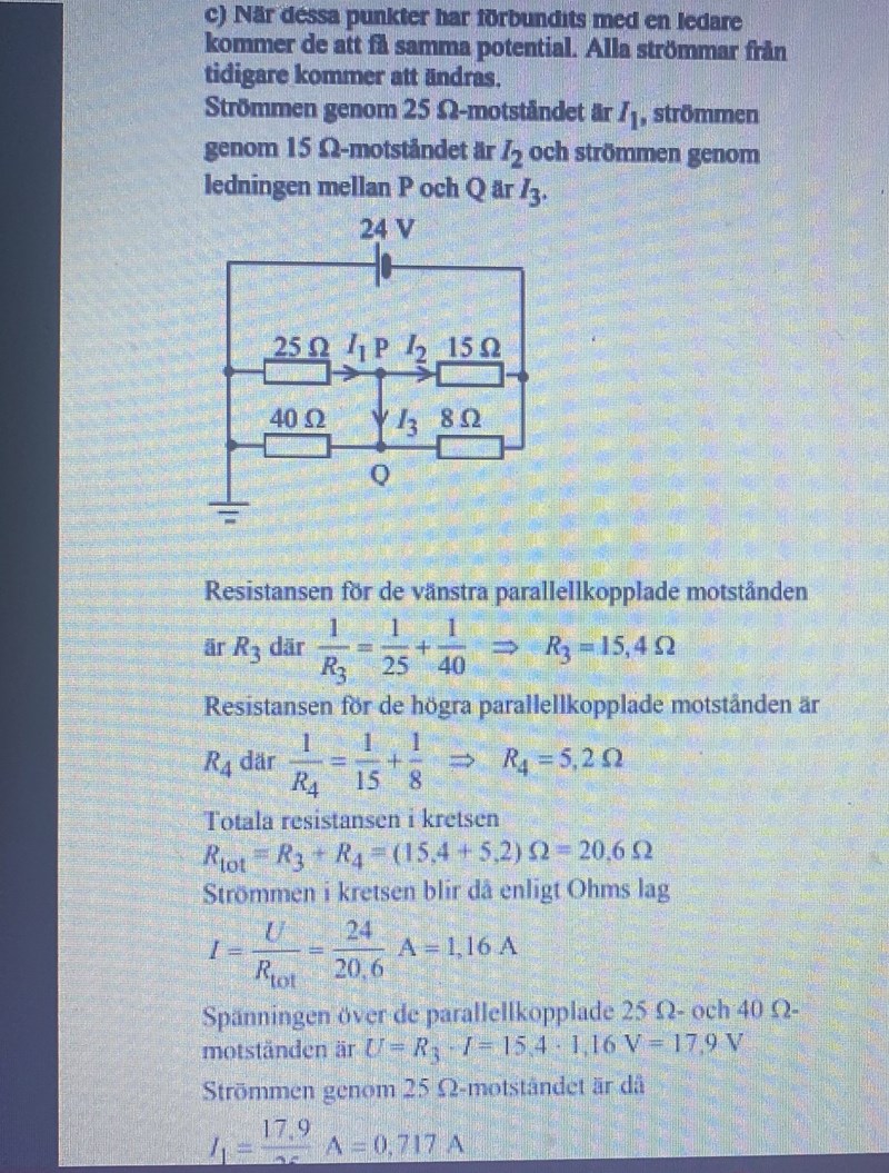 Okej då förstår jag varför det är så och jag förstår även att de beräknar den totala strömmen. Däremot förstår jag fortfarande inte resterande delen av lösningen, bland annat varför de väljer att beräkna ersättningsresistansen över parallellkopplingarna och inte seriekopplingarna, vilket de sedan använder för att beräkna spänningen i 25 motståndet och 15 motståndet. När dessa spänningar beräknas används ju totala strömmen 1.16 men eftersom motstånden är parallellkopplade är ju strömmen olika? Eller får man räkna på den totala strömmen eftersom det är en ersättningsresistans? Dessutom är alla fyra motstånden kopplade till varandra på ett eller annat sätt, varför tar man inte med att tex 25 motståndet egentligen inte bara är parallellkopplat till 40 motståndet utan även 8 motsåndet. Förlåt för att det är så många frågor.
