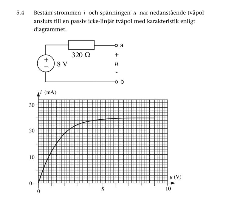 Har svårt att förstå uppgiften. Har iallafall utfrån bilden på tvåpolen räknat ut att i = 8/320 = 25mA mha KVL. Har sedan försökt rita ut grafen till denna tvåpol men vet inte hur rent mattematiskt ska räkna ut någon skärningspunkt (Om det är så det är tänkt att man ska göra). En annan idé jag har att att på något sätt använda kortslutningsströmmen och tomgångsspänning.