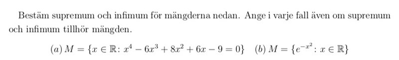 Är 3 en övre begränsning till M? Ja, uppenbarligen så gäller det att m 3 för alla m M. Så 3 är en övre begränsning till M. Eftersom 3 även tillhör M så måste detta vara den minsta övre begränsningen. Så supM = 3.