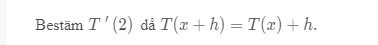 Hej. Fastnat lite här, för att kunna använda derivatans definition måste vi ha T(x+h) samt T(x). Men vi har ju inte T(x) så hur fortsätter jag?
