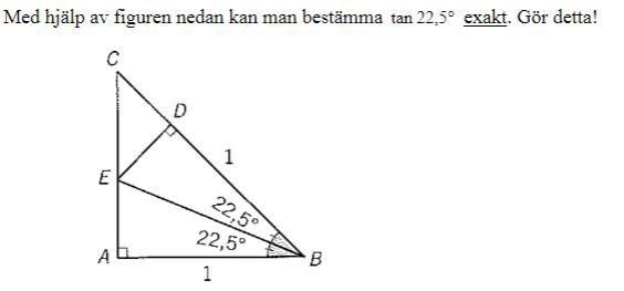 Jag behöver ta reda på ED eller EA. Jag försöker lösa den med hjälp av likformighet. Har tagit reda på att BD är lika lång som AC (1). CDE är likformig med ABC. Men sen har jag fastnat för jag saknar siffor för att kunna lösa ut någon sida i den lilla triangeln utan att ta hjälp av tan 22,5 vilket ger mig en massa decimaler (jag ska svara exakt)