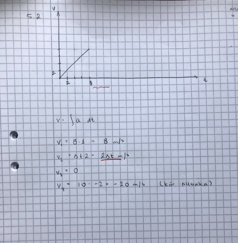 Och därmed ökar hastigheten från 8 m/s i slutet av första intervallet, med 12 m/s till 20 m/s i slutet av andra intervallet, som sedan i fjärde intervallet reduceras med 20 m/s till 0 m/s i slutändan.